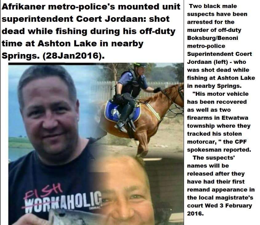 Today, Wednesday 3 February 2016: A brief court appearance in Boksburg/Benoni area magistrate's court: two black males who were arrested for the murder of the local metropolitan police's mounted unit commander, superintendent Coert Jordaan (40): (arrest was reported by the Boksburg/Benoni Community Policing Forum. People are encouraged to attend the proceedings, when the date will be set for their bail applications.}